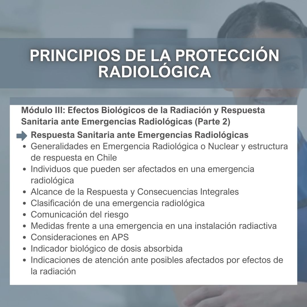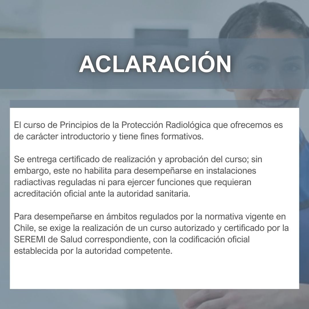 El curso Principios de la Protección Radiológica es una capacitación e-learning asincrónica de 40 horas pedagógicas, orientada a entregar conocimientos fundamentales de la protección radiológica y su aplicación en contextos laborales donde exista exposición a radiaciones ionizantes.