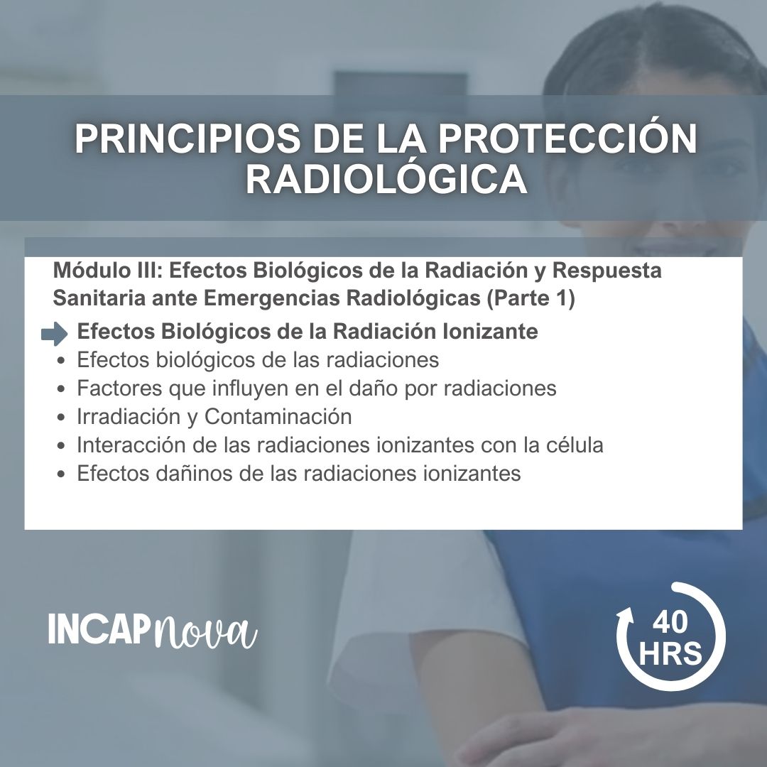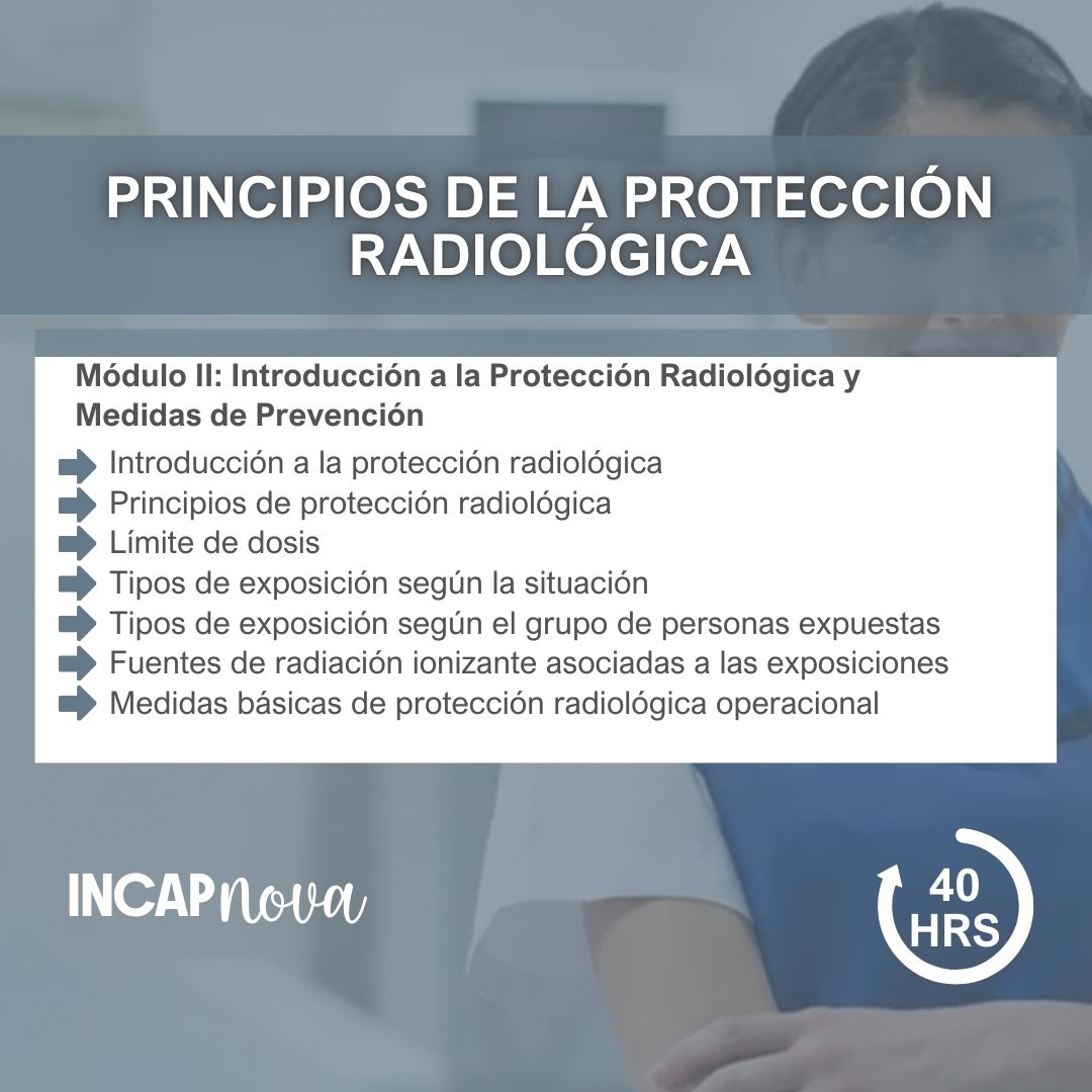 A lo largo del programa se revisan los fundamentos técnicos y normativos que sustentan los principios de la protección radiológica, incluyendo conceptos básicos, límites de dosis, nociones de dosimetría, señalética de seguridad y responsabilidades institucionales en materia de protección radiológica.